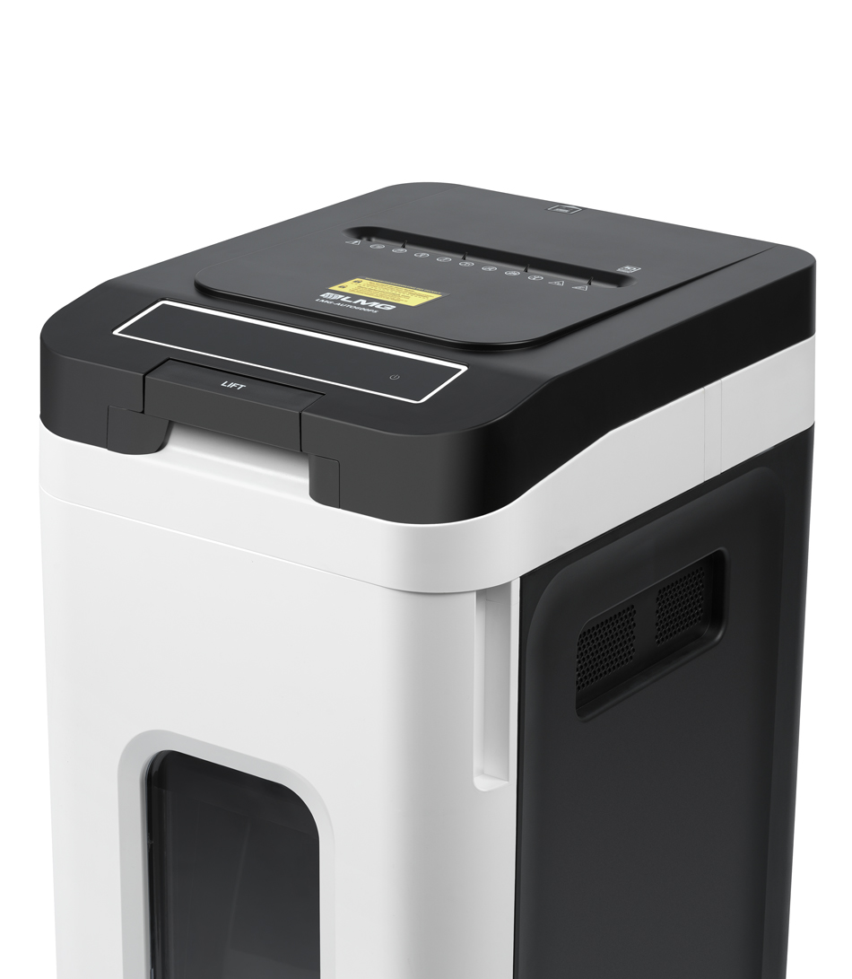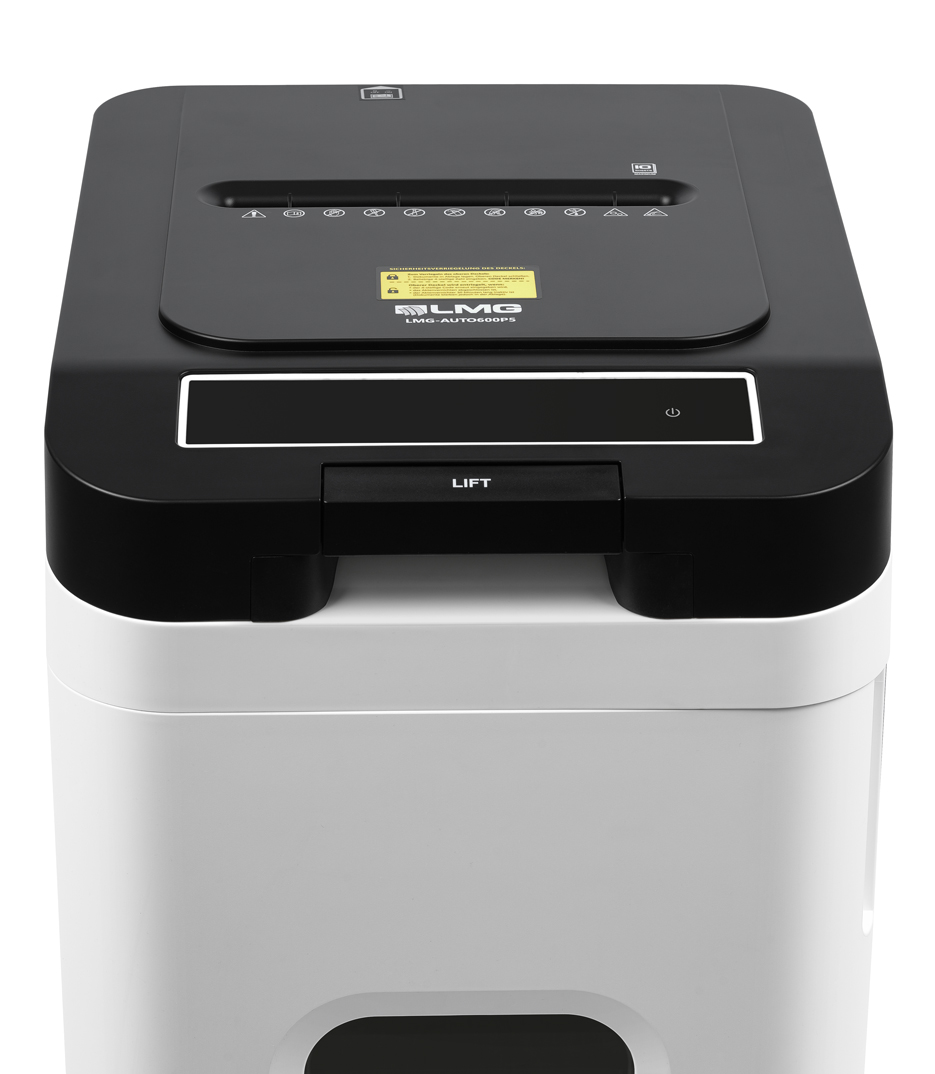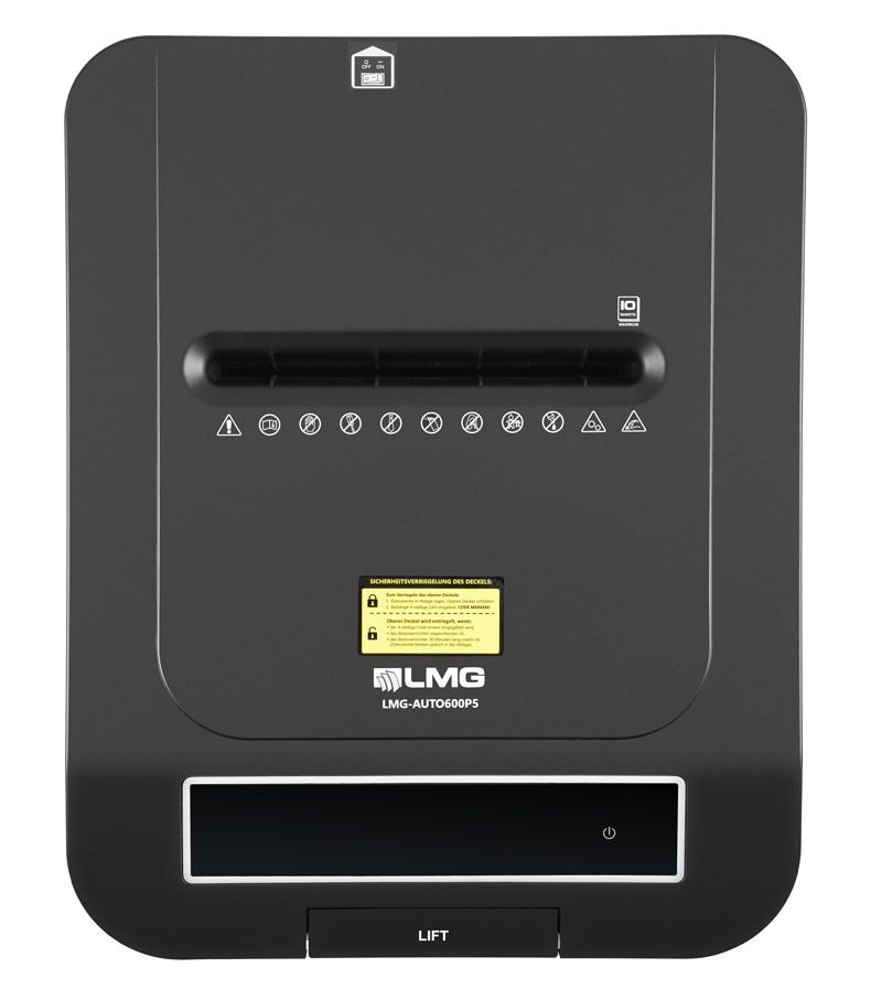 Der hochmoderne LMG Autofeed-Aktenvernichter erspart Ihnen kostbare Zeit und vernichtet all Ihre Dokumente, ohne, dass Sie daneben stehen müssen. Legen Sie bis zu 350 Blatt auf einmal in die Vorrichtung. Die patentierte Autofeed-Technologie erledigt den Rest problemlos und hört erst dann wieder auf, wenn all Ihre Unterlagen in winzig kleine 4x12 mm Schnipsel zerkleinert worden sind.Die manuelle Zufuhr im oberen Bereich kann bis zu 10 Blatt auf einmal verarbeiten.Zerkleinerung für besonders vertrauliche Dokumente und DSGVO konformDer Premium Aktenschredder ist mit der Sicherheitsstufe P-4 ausgestattet. Die Größe der einzelnen Partikel sind mit 4x12 mm ganz besonders klein für diese Sicherheitsklasse, da die Größe sich nur knapp vor der Stufe P-5 befindet.Premium Schneidwerk für eine lange LebensdauerDie extrem kraftvoll rotierenden Schneidmesser überzeugen durch eine ausgezeichnete Verarbeitung und sind besonders scharf. Das gewährleistet eine zuverlässige und ausdauernde vernichtung Ihrer vertraulichen Dokumente. Auch vernichtet werden können Heftklammern, Büroklammern, CD's und Kreditkarten. Besonders gesichert durch PIN-SperreEine integrierte Absicherung schützt Ihre Unterlagen vor Unbefugten. Vergeben Sie für jeden Schreddervorgang eine 4-stellige Sicherheitspin, die nur Sie wissen. Während der Schreddervorgangs kann das Zufuhrfach nur noch durch Eingabe des PIN's, oder durch Beendigung der Vorgangs geöffnet werden.Großer Abfallbehälter und leise AnwendungLeise rieseln die Schnipsel: In den riesigen Abfallbehälter mit erstaunlichen 70 Liter Fassungsvermögen. Und das so angenehm leise (58dB), dass Sie nebenbei problemlos weiterarbeiten können.Alle besonderen Merkmale auf einen Blick:- Sicherheitsstufe P-4 (4x12 mm)- Anti-Stau-Funktion - Touch-Bedienfeld- Max. Betriebsdauer 120 min danach 45 min Pause- 53 Liter Fassungsvermögen - Herausnehmbarer Behällter- PIN-Sperre 4-stellig gegen unbefugten Zugriff- Automatische Abschaltung bei Inaktivität- Automatische Abschaltung wenn Behälter voll ist- Kann auch verwerten: Büroklammern, Heftklammern, CD's,Kreditkarten, andere Plastikkarten- Autofeed: 350 Blatt, Manuell: 10 Blatt - Auf Rollen stehend- Sichtfenster an der vorderen Seite - Leistungsstarkes Kühlsystem - Modernes, schlankes DesignAbmessungen: 406 x 503 x 750 mm Gewicht: 25 kg