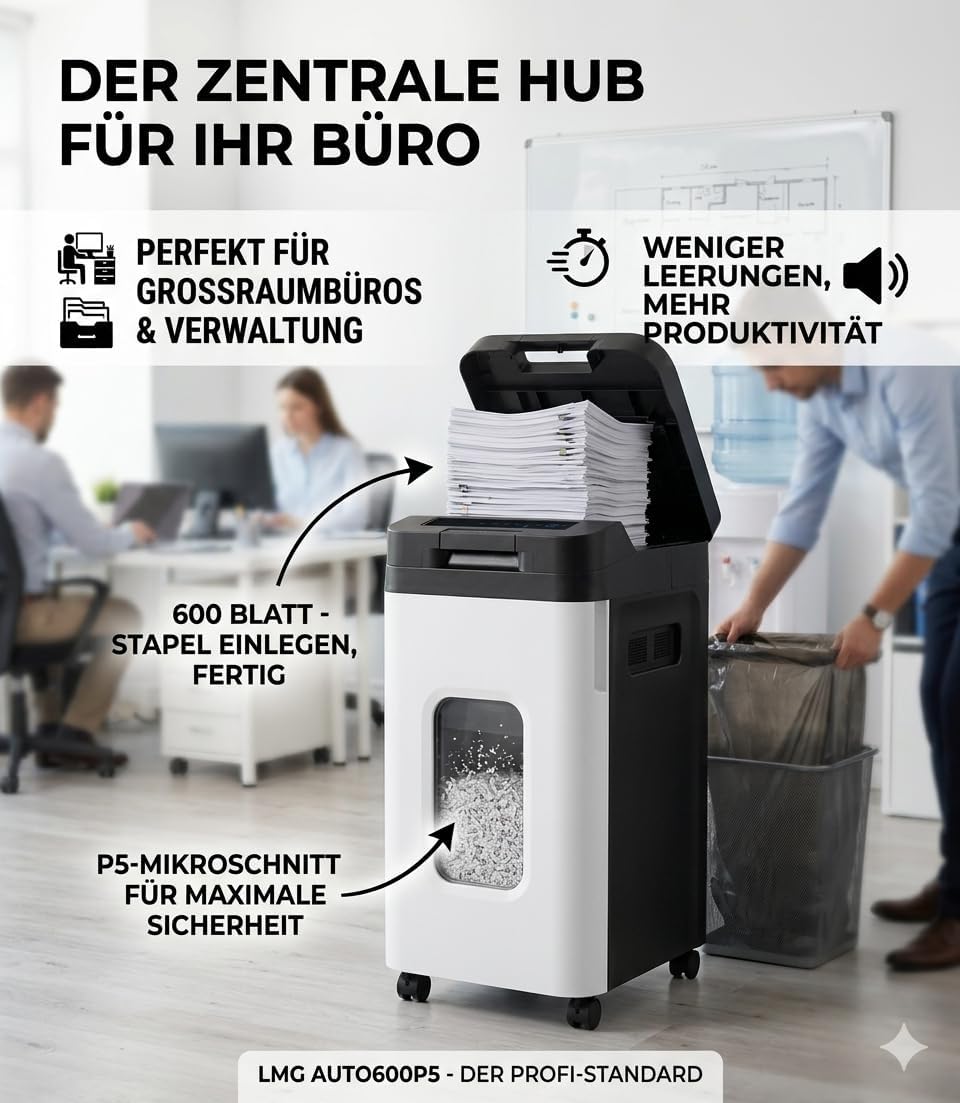 Der moderne Autofeed-Aktenschredder von LMG überzeugt durch eine Reihe an Innovationen und ausgezeichneter Wertigkeit.Automatischer Schredder: Hochsicherheits-Schredder mit 120-Blatt Fassungsvermögen für die vollautomatisierte Zerkleinerung - Zerkleinert Ihre sensiblen Dokumente in 2x12 mm Mini-Schnipsel (P-5) - Premium Schneidwerk mit garantiert höchster AusdauerDie neue Flüsterversion: Der besondere Autofeed-Papiervernichter zerkleinert Ihre Dokumente, ohne, dass Sie daneben stehen müssen- 120 Blatt einlegen und andere Dinge tun. Mit nur max. 65dB erledigt der Profi seinen Job problemlosSchutz vor Überhitzung: Mit der neuesten Technik kann der neue Auto-Schredder einer drohenden Überhitzung zuvorkommen und stoppt automatisch. Inkl. Behälter-Voll-Anzeige. Auch Heftklammern bis 10 Blatt stellt kein Hindernis dar60 Minuten Dauerbetrieb: Vernichten Sie problemlos auch Kreditkarten (über den manuellen Einführschlitz) , Heftklammern können einfach über die Auto-Funktion geschreddert werden (max. 10 geheftete Blätter) - DSGVO KonformPerfekt für das BüroDie Wunderwaffe auf 4 Rädern passt perfekt unter jeden Schreibtisch und ist dank seiner 4 Rollen (mit Bremse) jederzeit mobil. Legen Sie einfach bis zu 120 Blatt ein und tun Sie andere Dinge•Automatisch bis zu 120 Blatt gleichzeitig•Manuell bis zu 10 Blatt•Verwertet Papier, Heftklammern und Plastikkarten•Integrierte Rollen mit Bremse•Sehr leise mit nur 65dB•Extrem kleine Papierschnipsel (2x12 mm)•Sicherheitsstufe P-5•DSGVO Konform-TÜV GEPRÜFT-