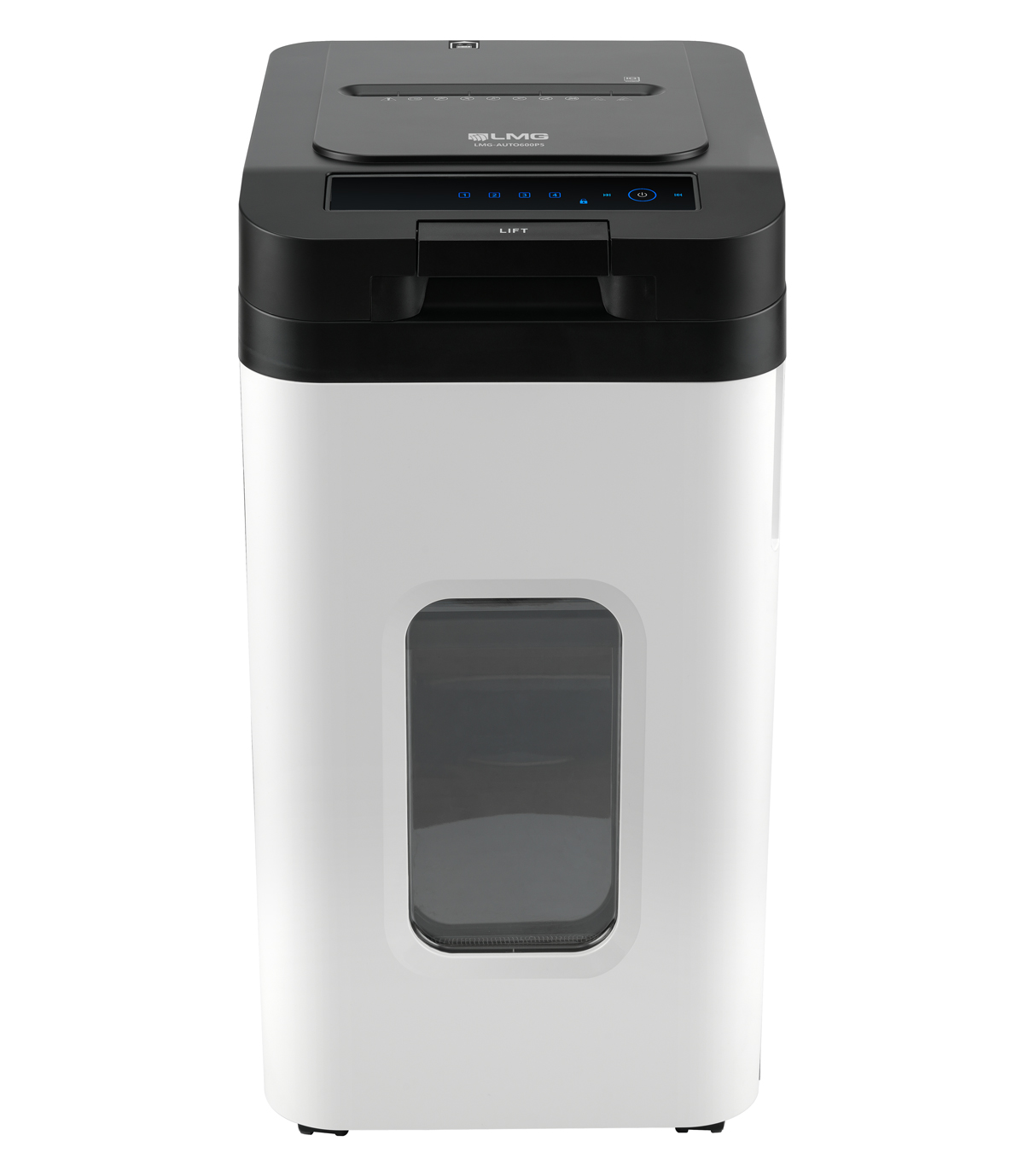 Der hochmoderne LMG Autofeed-Aktenvernichter erspart Ihnen kostbare Zeit und vernichtet all Ihre Dokumente, ohne, dass Sie daneben stehen müssen. Legen Sie bis zu 350 Blatt auf einmal in die Vorrichtung. Die patentierte Autofeed-Technologie erledigt den Rest problemlos und hört erst dann wieder auf, wenn all Ihre Unterlagen in winzig kleine 4x12 mm Schnipsel zerkleinert worden sind.Die manuelle Zufuhr im oberen Bereich kann bis zu 10 Blatt auf einmal verarbeiten.Zerkleinerung für besonders vertrauliche Dokumente und DSGVO konformDer Premium Aktenschredder ist mit der Sicherheitsstufe P-4 ausgestattet. Die Größe der einzelnen Partikel sind mit 4x12 mm ganz besonders klein für diese Sicherheitsklasse, da die Größe sich nur knapp vor der Stufe P-5 befindet.Premium Schneidwerk für eine lange LebensdauerDie extrem kraftvoll rotierenden Schneidmesser überzeugen durch eine ausgezeichnete Verarbeitung und sind besonders scharf. Das gewährleistet eine zuverlässige und ausdauernde vernichtung Ihrer vertraulichen Dokumente. Auch vernichtet werden können Heftklammern, Büroklammern, CD's und Kreditkarten. Besonders gesichert durch PIN-SperreEine integrierte Absicherung schützt Ihre Unterlagen vor Unbefugten. Vergeben Sie für jeden Schreddervorgang eine 4-stellige Sicherheitspin, die nur Sie wissen. Während der Schreddervorgangs kann das Zufuhrfach nur noch durch Eingabe des PIN's, oder durch Beendigung der Vorgangs geöffnet werden.Großer Abfallbehälter und leise AnwendungLeise rieseln die Schnipsel: In den riesigen Abfallbehälter mit erstaunlichen 70 Liter Fassungsvermögen. Und das so angenehm leise (58dB), dass Sie nebenbei problemlos weiterarbeiten können.Alle besonderen Merkmale auf einen Blick:- Sicherheitsstufe P-4 (4x12 mm)- Anti-Stau-Funktion - Touch-Bedienfeld- Max. Betriebsdauer 120 min danach 45 min Pause- 53 Liter Fassungsvermögen - Herausnehmbarer Behällter- PIN-Sperre 4-stellig gegen unbefugten Zugriff- Automatische Abschaltung bei Inaktivität- Automatische Abschaltung wenn Behälter voll ist- Kann auch verwerten: Büroklammern, Heftklammern, CD's,Kreditkarten, andere Plastikkarten- Autofeed: 350 Blatt, Manuell: 10 Blatt - Auf Rollen stehend- Sichtfenster an der vorderen Seite - Leistungsstarkes Kühlsystem - Modernes, schlankes DesignAbmessungen: 406 x 503 x 750 mm Gewicht: 25 kg