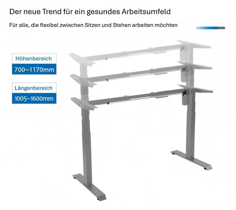 Das höhenverstellbare Tischgestell von LMG überzeugt durch neueste Technik und herausragender Qualität.Technische Details und Vorteile auf einen Blick:Hochsensibler Anti-Kollisions-SchutzMemory-Funktion mit 4 Speicher.3 kraftvolle Motoren.Breite je Seite anpassbar von 1050-1800 mmBreite insgesamt bis 3600 mmHöhe regulierbar von 600-1250 mm3-Fach-Teleskop-Schub.Massives 3-Träger-Stützsystem.Leise mit max. 48dB.Ergonomisches Arbeiten.Individuell für viele Tischplatten.Gewicht: 38 kgUnser Premium Tischgestell unterstützt Sie dabei, wieder schmerzfreier und beweglicher zu werden. Die vielen Jahre sitzend an Ihrem Arbeitsplatz haben Spuren hinterlassen. Regulieren Sie die Tischplatte passend Ihrer Stehhöhe auf Knopfdruck bis zu einer Höhe von 1250 mm. Entscheiden Sie, ob Sie sitzen oder stehen wollen. In nur wenigen Sekunden ist ihre perfekte Höheneinstellung erreicht.Individuell Ihren Wünschen anpassbar mit Memory: Speichern Sie unter 4 Auswahltasten für jede Steh- und Sitzhaltung die passende Höhe. Die justierbaren Standfüße passen sich problemlos jedem Untergrund an. Das ausziehbare Mittelstück verleiht Ihnen Spielraum bei der Tischplatten-Auswahl (Ausziehbar von 1050-1800 mm).Unser höhenverstellbares Tischgestell verfügt über 3 gleichgeschaltete, kraftvolle Motoren. Dies gewährleistet eine langlebige Verwendung! Durch die Aufteilung der Last auf 3 Motoren, erleben Sie ein noch geschmeidigeres Hoch- und Runterfahren mit lediglich max. 48 dB. Die Motoren sind also nicht nur leise, sondern auch stark! Bis zu 160kg Traglast stellen kein Problem dar.Intelligente Anti-Kollisions-Technik: Die speziell und neu entwickelte Technik verhindert das schädliche Zusammenstoßen beim Hoch- oder Runterfahren. Noch feinere Sensoren vermindern die Härte des Aufpralls auf ein Minimum. Sobald die montierte Tischplatte auf ein Hindernis im hydraulischem Modus trifft, bewegt diese sich sofort in die entgegengesetzte Richtung und stoppt auf der Stelle.Premium Qualität: Das massive Tischgestell mit einem Gewicht von 38 kg begeistert durch eine ausgesprochen hochwertige Verarbeitung. Das starke 3-Träger Stützsystem hält einer jahrelangen Belastung problemlos stand, und sorgt zugleich für einen passgenau ausbalancierten, festen Stand. - Auch bei Standhöhe.