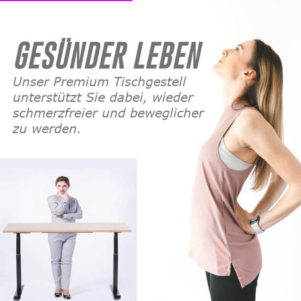 Unser Premium Tischgestell unterstützt Sie dabei, wieder schmerzfreier und beweglicher zu werden.Die vielen Jahre sitzend an Ihrem Arbeitsplatz haben Spuren hinterlassen. Regulieren Sie die Tischplatte passend Ihrer Stehhöhe auf Knopfdruck bis zu einer Höhe von 1170 mm. Entscheiden Sie, ob Sie sitzen oder stehen wollen. In nur wenigen Sekunden ist ihre perfekte Höheneinstellung erreicht.Individuell Ihren Wünschen anpassbarDas ausziehbare Mittelstück verleiht Ihnen Spielraum bei der Tischplatten-Auswahl (Ausziehbar von 1005-1600 mm).Das LMG höhenverstellbare Tischgestell verfügt über einen, kraftvollen Motor. Intelligente Anti-Kollisions-TechnikDie speziell und neu entwickelte Technik verhindert das schädliche Zusammenstoßen beim Hoch- oder Runterfahren. Noch feinere Sensoren vermindern die Härte des Aufpralls auf ein Minimum. Sobald die montierte Tischplatte auf ein Hindernis im hydraulischen Modus trifft, bewegt sich diese sofort in die entgegengesetzte Richtung und stoppt auf der Stelle.Premium QualitätDas massive Tischgestell mit einem Gewicht von 21 kg begeistert durch eine ausgesprochen hochwertige Verarbeitung. Das starke 2-Träger Stützsystem hält einer jahrelangen Belastung problemlos stand, und sorgt zugleich für einen passgenau ausbalancierten, festen Stand. - Auch bei Standhöhe.Technische Details und Vorteile auf einen Blick:Hochsensibler Anti-Kollisions-Schutz1 kraftvoller MotorBreite anpassbar von 1005-1600 mmHöhe regulierbar von 700-1170 mm2-Fach-Teleskop-SchubMassives 2-Träger-StützsystemLeise mit max. 48dBErgonomisches ArbeitenIndividuell für viele TischplattenGewicht: 21 kgBreite 1005-1600 mmTiefe: 650 mm