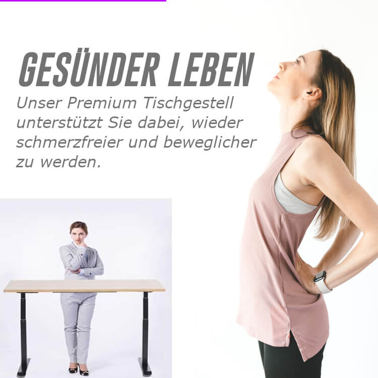 Unser Premium Tischgestell unterstützt Sie dabei, wieder schmerzfreier und beweglicher zu werden.Die vielen Jahre sitzend an Ihrem Arbeitsplatz haben Spuren hinterlassen. Regulieren Sie die Tischplatte passend Ihrer Stehhöhe auf Knopfdruck bis zu einer Höhe von 1170 mm. Entscheiden Sie, ob Sie sitzen oder stehen wollen. In nur wenigen Sekunden ist ihre perfekte Höheneinstellung erreicht.Individuell Ihren Wünschen anpassbarDas ausziehbare Mittelstück verleiht Ihnen Spielraum bei der Tischplatten-Auswahl (Ausziehbar von 1005-1600 mm).Das LMG höhenverstellbare Tischgestell verfügt über einen, kraftvollen Motor. Intelligente Anti-Kollisions-TechnikDie speziell und neu entwickelte Technik verhindert das schädliche Zusammenstoßen beim Hoch- oder Runterfahren. Noch feinere Sensoren vermindern die Härte des Aufpralls auf ein Minimum. Sobald die montierte Tischplatte auf ein Hindernis im hydraulischen Modus trifft, bewegt sich diese sofort in die entgegengesetzte Richtung und stoppt auf der Stelle.Premium QualitätDas massive Tischgestell mit einem Gewicht von 21 kg begeistert durch eine ausgesprochen hochwertige Verarbeitung. Das starke 2-Träger Stützsystem hält einer jahrelangen Belastung problemlos stand, und sorgt zugleich für einen passgenau ausbalancierten, festen Stand. - Auch bei Standhöhe.Technische Details und Vorteile auf einen Blick:Hochsensibler Anti-Kollisions-Schutz1 kraftvoller MotorBreite anpassbar von 1005-1600 mmHöhe regulierbar von 700-1170 mm2-Fach-Teleskop-SchubMassives 2-Träger-StützsystemLeise mit max. 48dBErgonomisches ArbeitenIndividuell für viele TischplattenGewicht: 21 kgBreite 1005-1600 mmTiefe: 650 mm