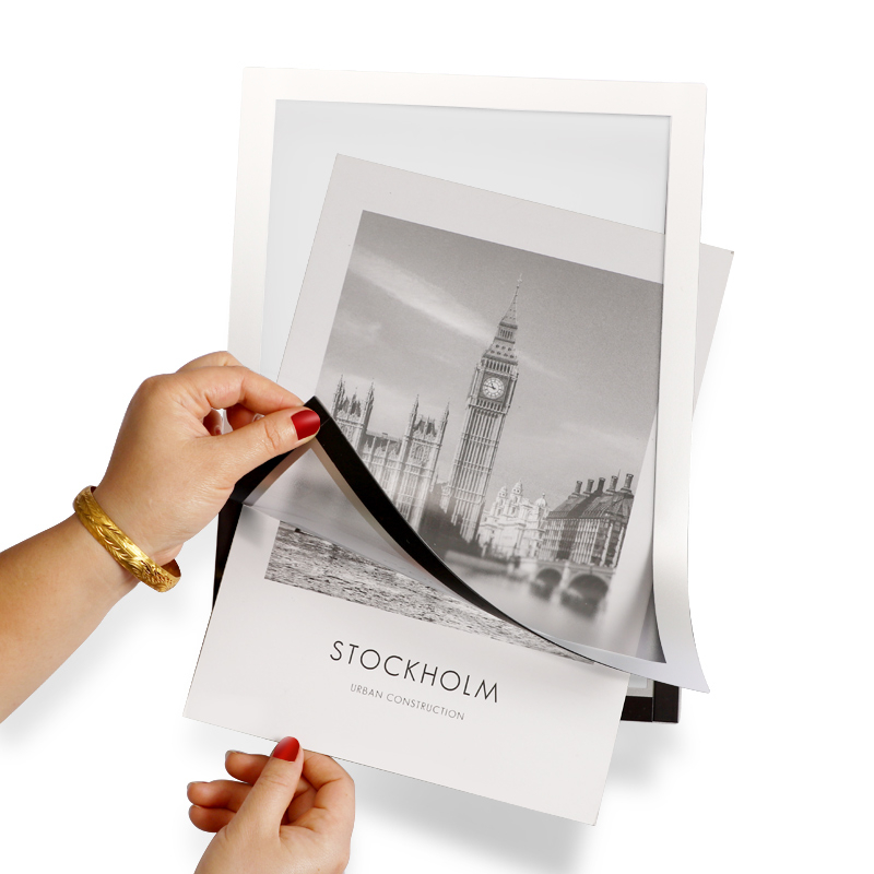 Die starke, selbstklebende Rückseite garantiert eine schnelle und mühelose Montage. Die Rahmen haften fest und sicher auf glatten Flächen, ohne dass Sie bohren oder Schrauben verwenden müssen. Ihre A3-Inhalte sind sofort am gewünschten Ort fixiert.