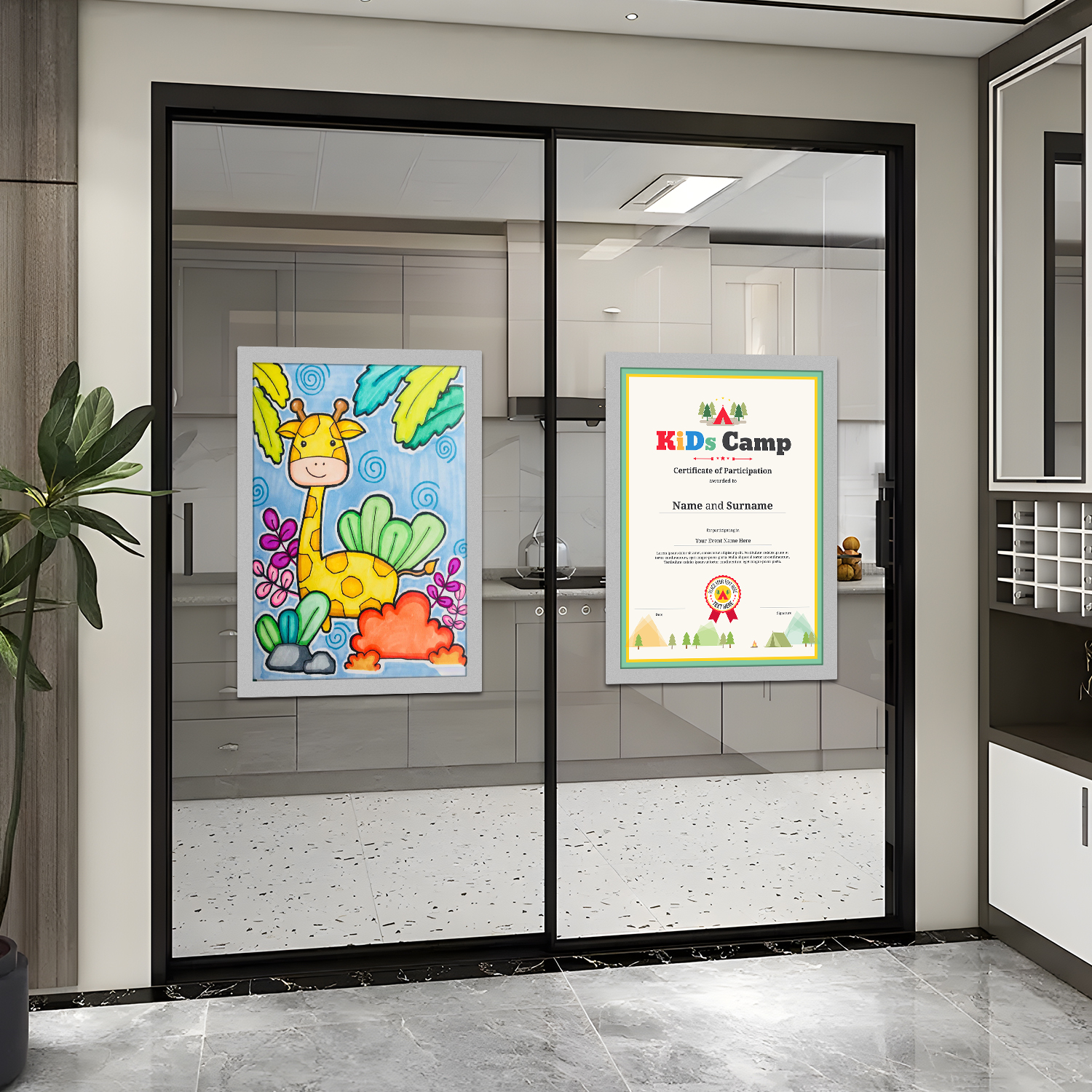 Eleganter weißer Magnetrahmen DIN A4 – Stilvolle und mühelose Präsentation Verleihen Sie Ihren Dokumenten, Zertifikaten oder Speisekarten eine moderne und helle Note mit unserem weißen Magnetrahmen im DIN A4 Format. Dieser Rahmen ist die perfekte Lösung für eine professionelle und stilvolle Darstellung Ihrer Inhalte im Büro, im Geschäft oder zu Hause. Zeitloses Design in Reinweiß Die Farbe **Weiß** steht für Klarheit und Eleganz. Dieser weiße Magnetrahmen fügt sich nahtlos in moderne, helle Umgebungen ein und sorgt dafür, dass Ihr Dokument optimal zur Geltung kommt. Die gerundeten Ecken verleihen dem Rahmen eine sanfte und zugleich moderne Optik. Mühelose Anbringung ohne Bohren Selbstklebende Rückseite: Dank der starken, selbstklebenden Folie ist die Montage auf glatten Oberflächen (wie Glas, Metall, Schränken oder Wänden) denkbar einfach – kein Bohren, kein Kleben. Schneller Dokumentenwechsel: Der magnetische Verschluss ermöglicht es Ihnen, Dokumente in Sekundenschnelle auszutauschen, ohne den Rahmen von der Wand nehmen zu müssen. Qualität und Langlebigkeit Gefertigt aus hochwertigen, robusten Materialien, garantiert dieser DIN A4 Magnetrahmen in Weiß eine lange Lebensdauer. Ihre wichtigen Informationen sind optimal geschützt und bleiben stets sichtbar. Integrierte Tasche für mehr Ordnung Jeder Rahmen verfügt über eine praktische, integrierte Dokumententasche (in Silber), ideal zur sicheren Aufbewahrung von Notizen, Visitenkarten oder kleineren Belegen – alles an einem Ort. Vielseitig einsetzbar: Büro: Aushänge, Wochenpläne, Zertifikate. Gastronomie: Speisekarten, Tagesangebote. Zuhause: Fotos, Urkunden, wichtige Mitteilungen. Setzen Sie auf den weißen DIN A4 Magnetrahmen, um Ihre Inhalte elegant und unkompliziert zu präsentieren. **Jetzt bestellen und für klare Akzente sorgen!**