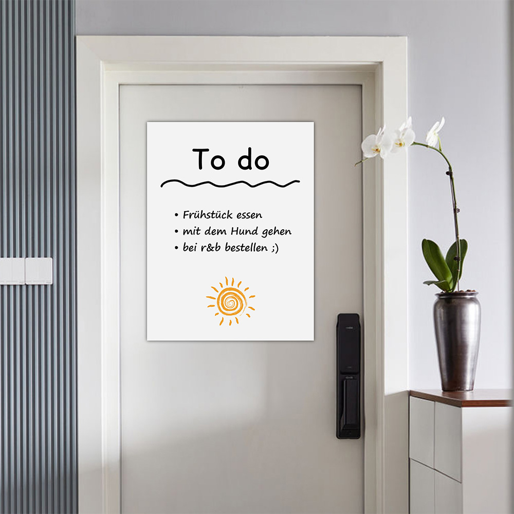 Mit einer Dicke von 1,2 mm ist die Folie besonders langlebig und stabil. Sie kann mehrfach verwendet werden, solange die Klebefläche sauber bleibt. Staubige Untergründe können die Haftung etwas reduzieren, doch auf sauberen Flächen bleibt sie dauerhaft nutzbar. Magnete haften an der Oberfläche – ideal zur Befestigung von Notizen, Zetteln oder Markerhaltern (Hinweis: Magnete nicht im Lieferumfang enthalten).