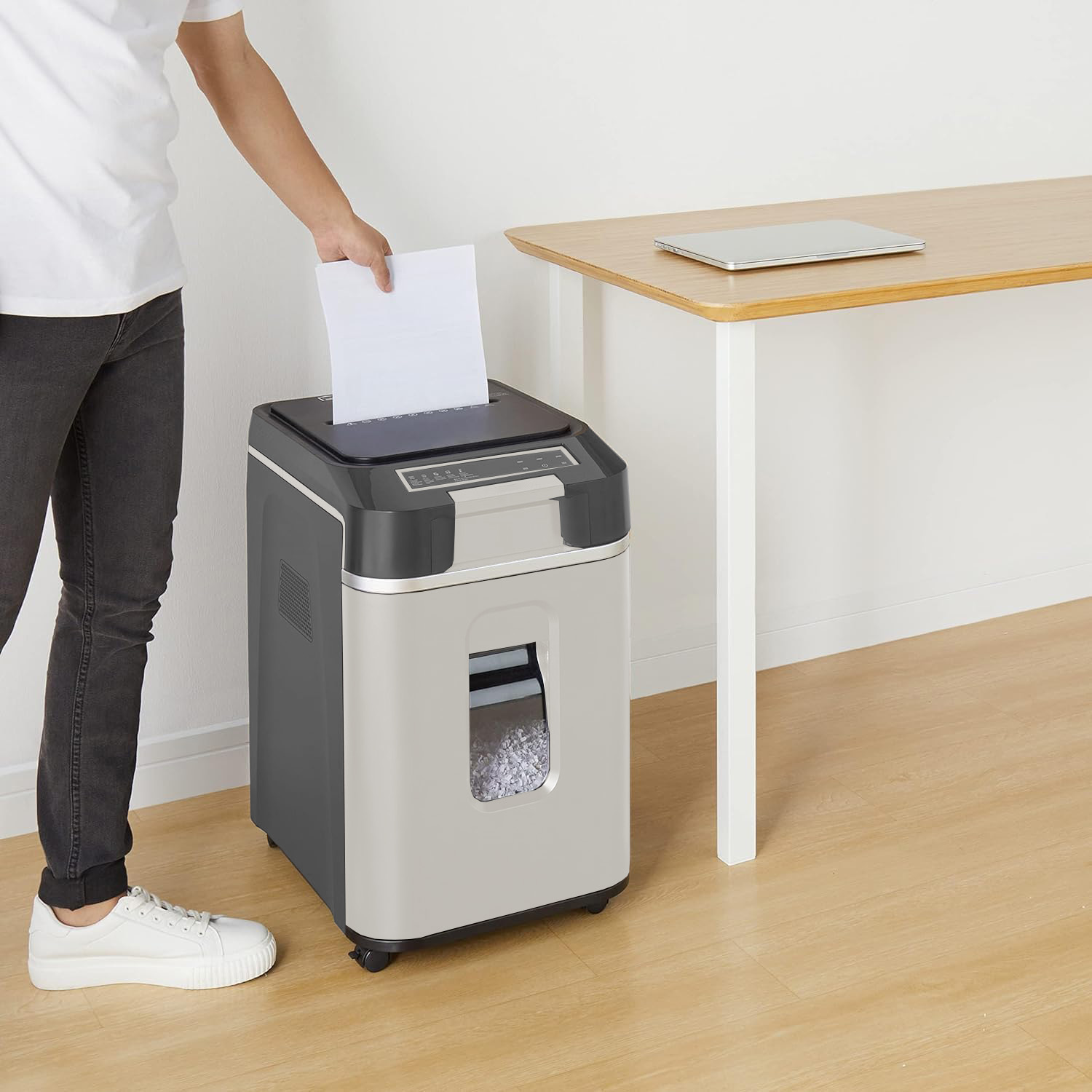 Einfach bis zu 200 Blatt einlegen – der Aktenvernichter arbeitet automatisch, leise und zuverlässig. Dank seiner kompakten Größe passt er bequem unter jeden Schreibtisch und ist selbst in ruhigen Arbeitsbereichen kaum hörbar. Die optimale Lösung für Datenschutz im täglichen Büroalltag.